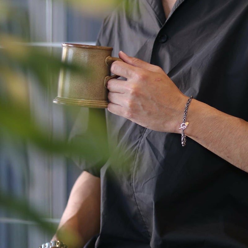 シンプルでキレイめな印象のチェーンブレスは多く出回っていますが、こちらはチェーンメイルを幾度もつなぎ合わせたアレンジが効いた形状