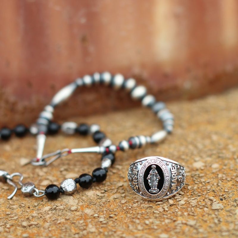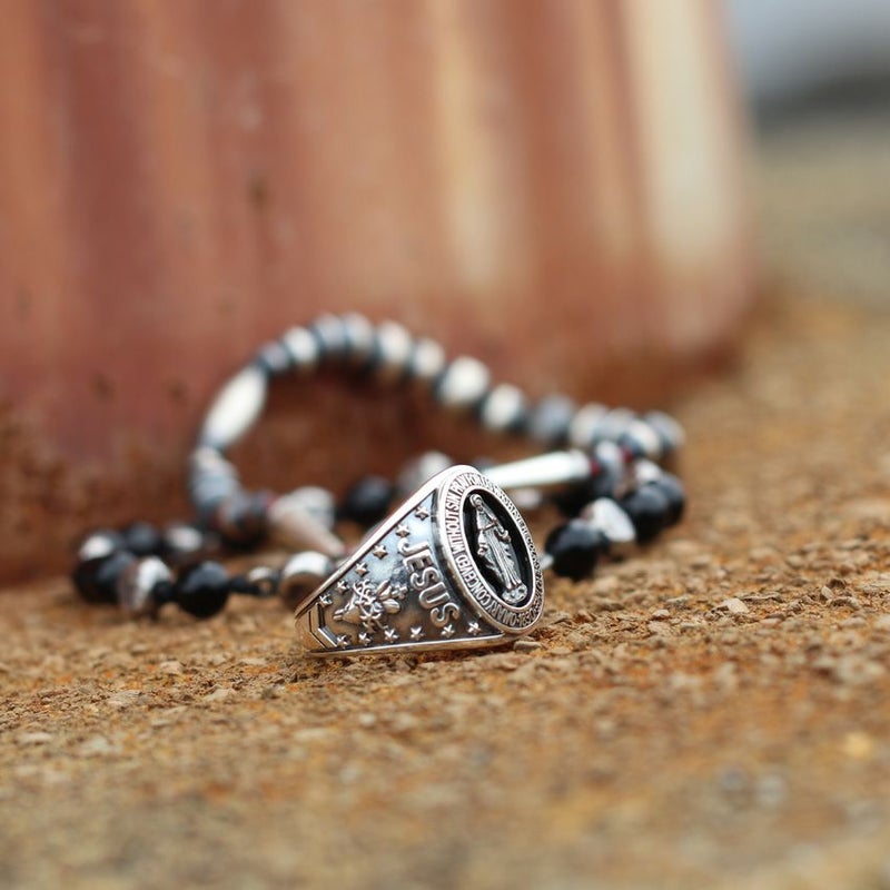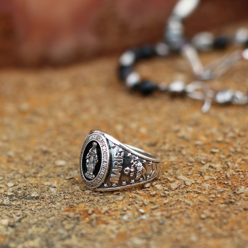 トップには、本物の天然石・オニキスを贅沢にあしらい、サイドには聖母マリア、キリストの聖心、そして教会を象徴する12個のスターを精巧にデザイン。