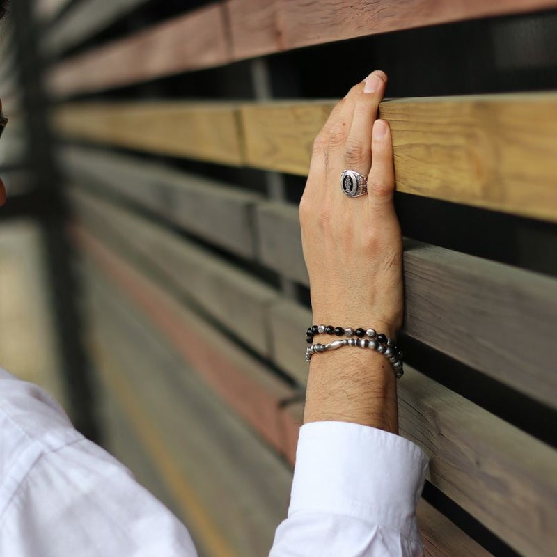 燻したガンメタカラーの窪みと、シルバーの美しい輝きが映える凸部分のコントラストが魅力。