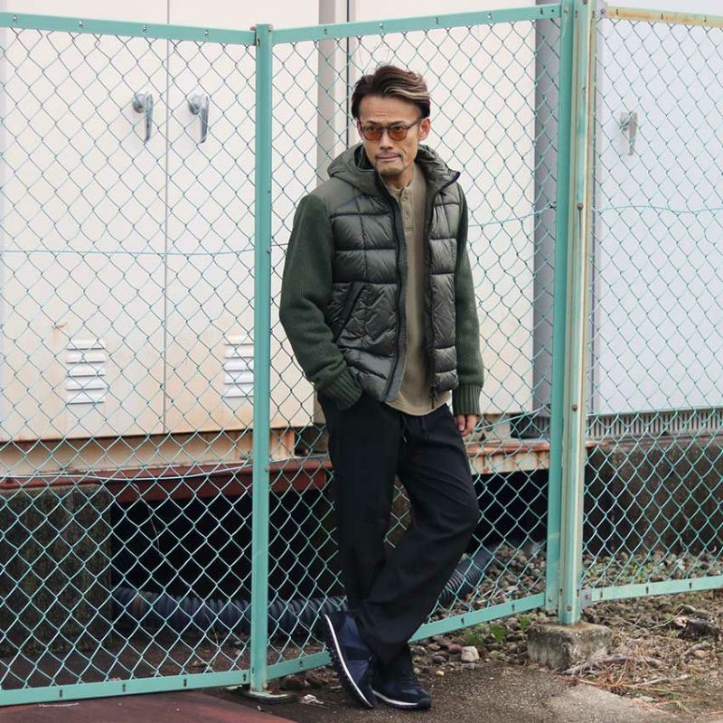 中綿アウターの優れた保温性を保ちながらニット素材の切り替えにより、