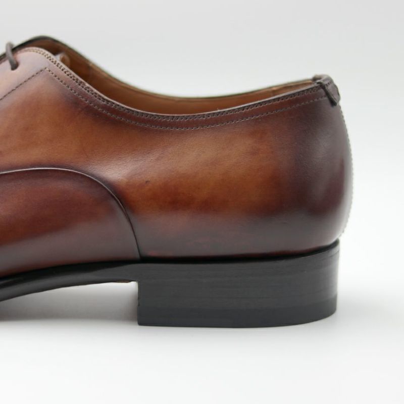 マグナーニのシューズに用いられる「パティーヌ仕上げ」により、グラデーション上に深みのある色合いの美しい表面が特徴です。色を何層にも重ねて染め上げており、手作業ならではの独特のムラ感が高級感を感じさせるポイントです。