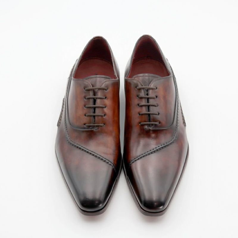 マグナーニのシューズに用いられる「パティーヌ仕上げ」により、グラデーション上に深みのある色合いの美しい表面が特徴です。色を何層にも重ねて染め上げており、手作業ならではの独特のムラ感が高級感を感じさせるポイントです。