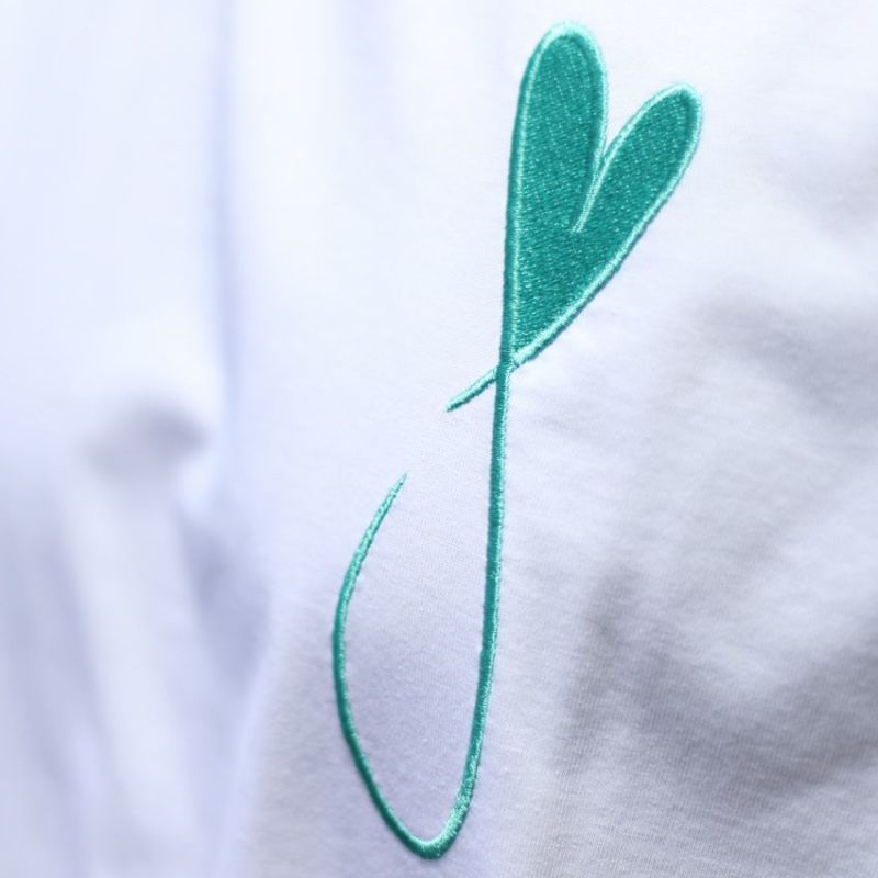 印象的なブルーのハートフィッシュ刺繍が目を引く、ワンランク上の大人Tシャツ。