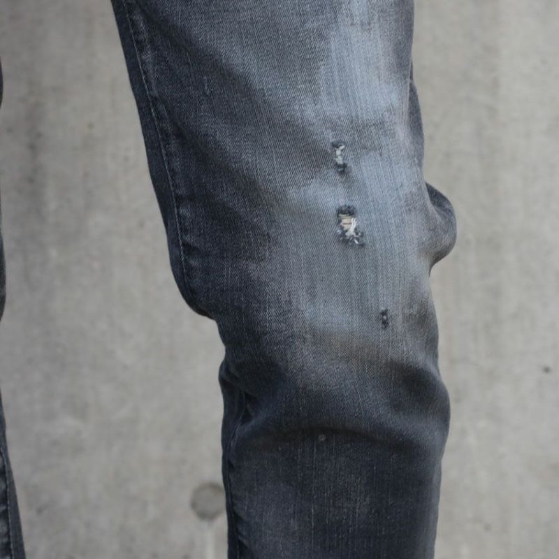 全体的に小さめのクラッシュ加工とペンキ加工が施されていて、裾はカットオフ仕様。