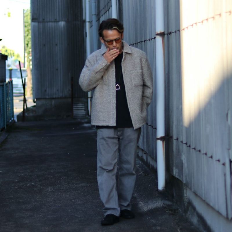 着丈はやや短めで、ワイドスラックスやデニムパンツと相性が良く
