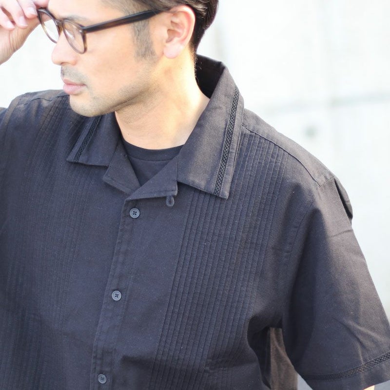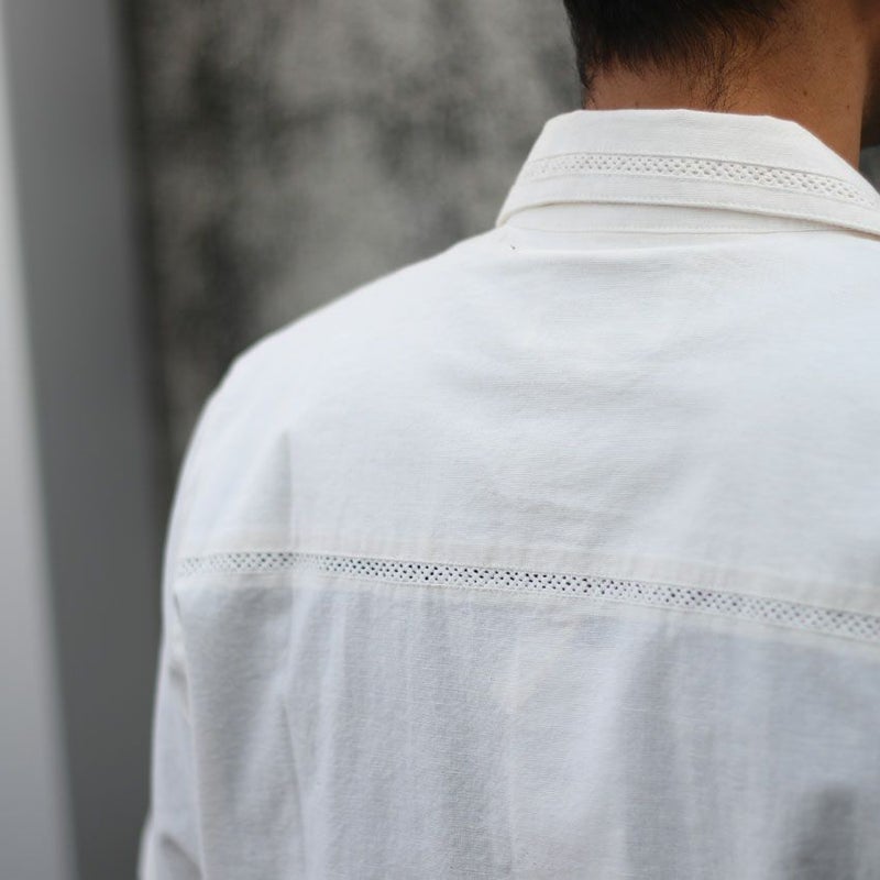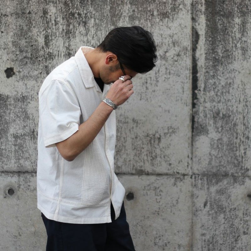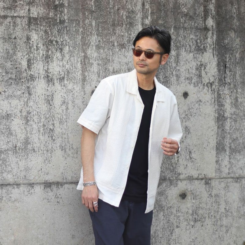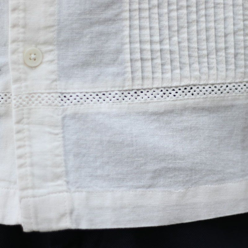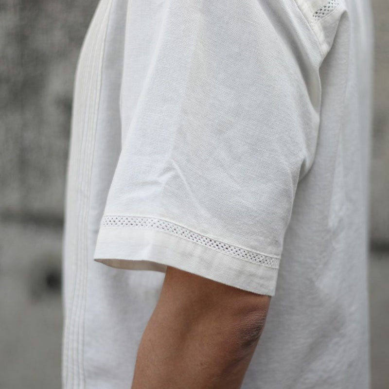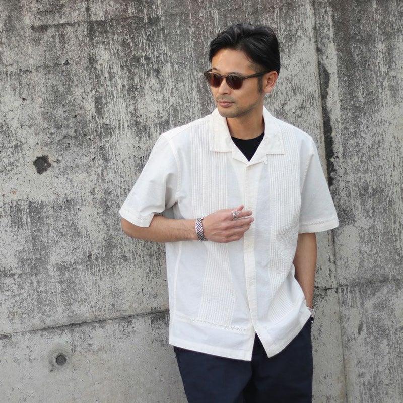 カラーは1色単ですが、本来のキューバシャツらしく長めで沢山寄せたピンタックと旬なクロシェ編みを袖や裾に配置した非常にデザインにも凝った1着です。