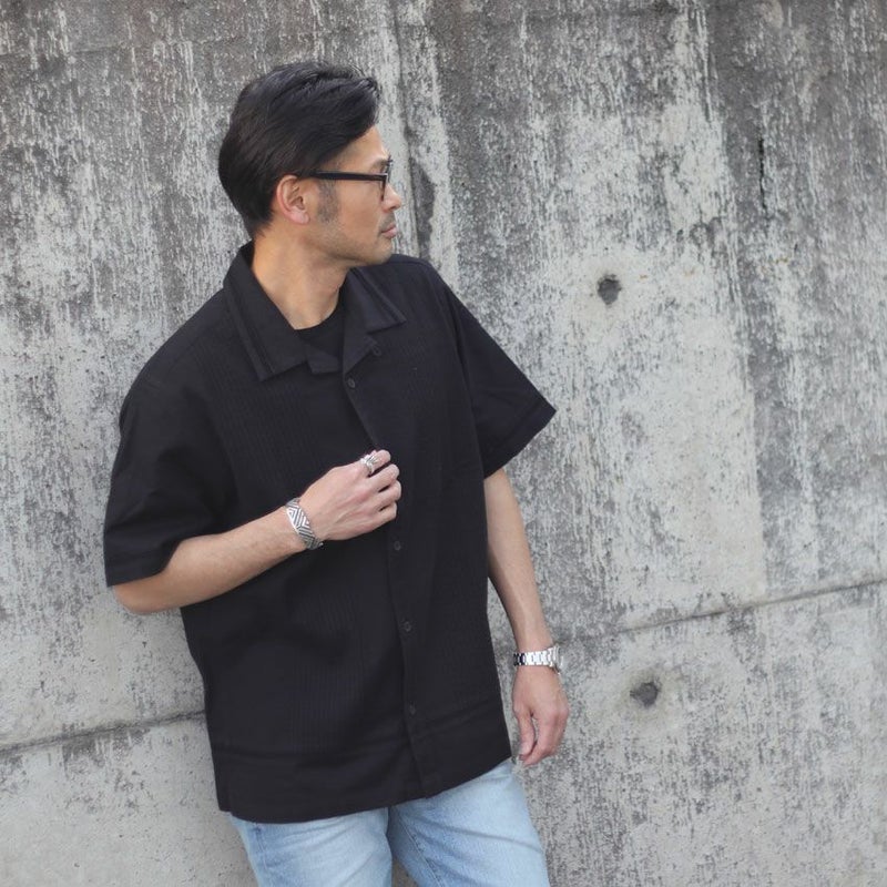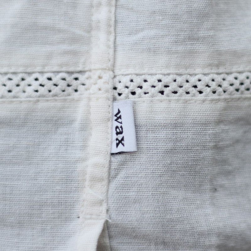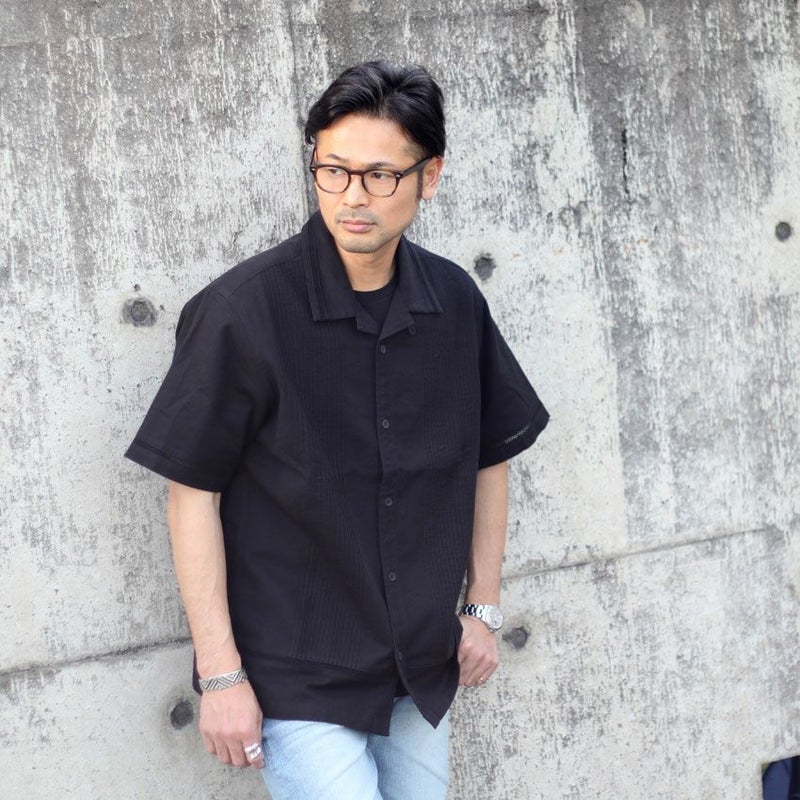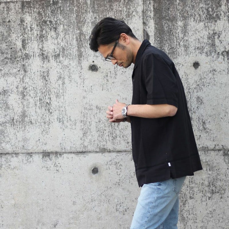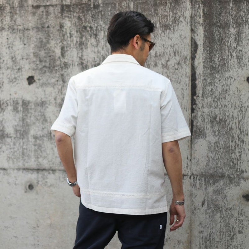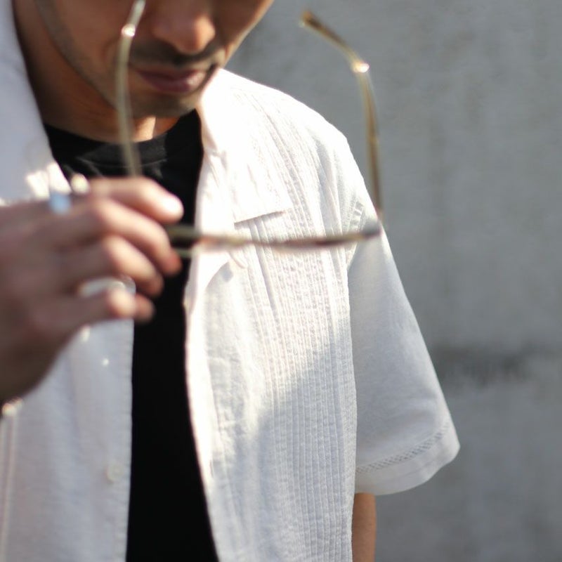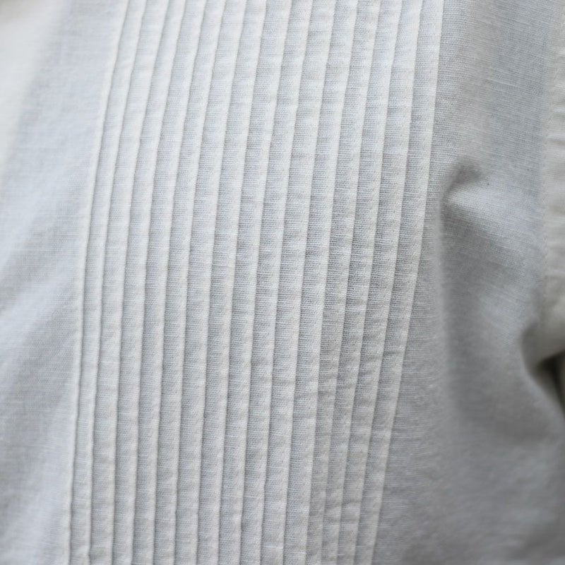 カラーは1色単ですが、本来のキューバシャツらしく長めで沢山寄せたピンタックと旬なクロシェ編みを袖や裾に配置した非常にデザインにも凝った1着です。