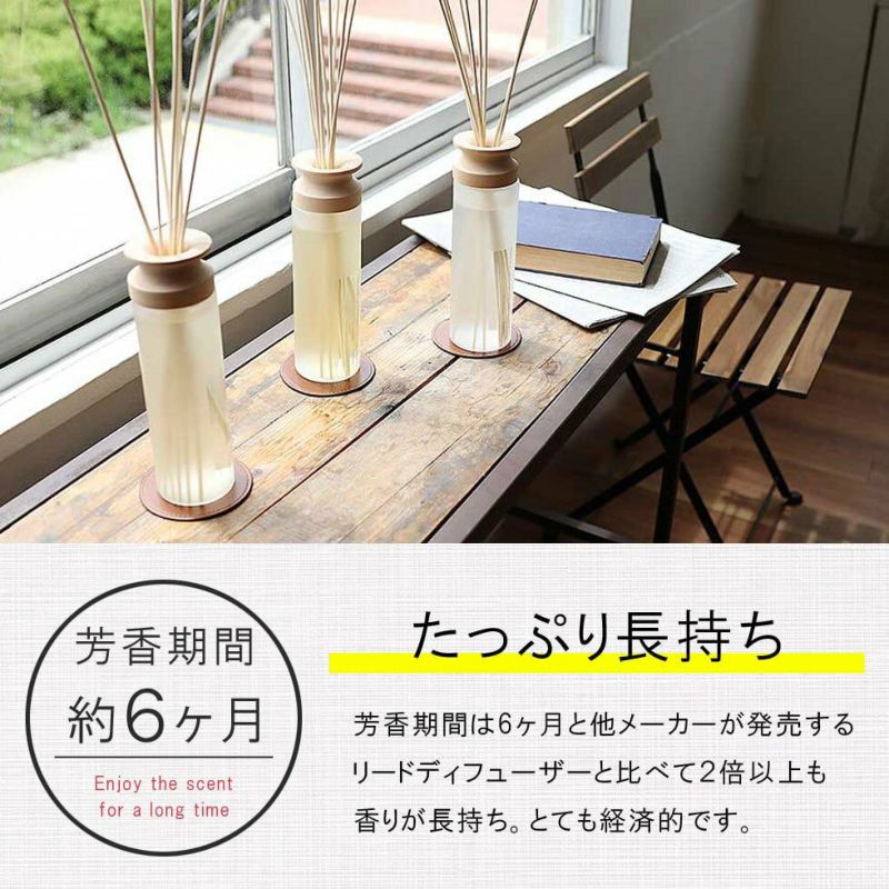 芳香期間は6か月と他メーカーが発売するリードディフューザーと比べて2倍以上も香りが長持ちで、経済的です。