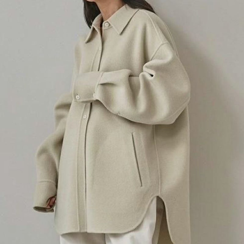 ミニマルなスリットポケットやアシンメトリーなボタン配置が、洗練されたモダンな印象を与えます。