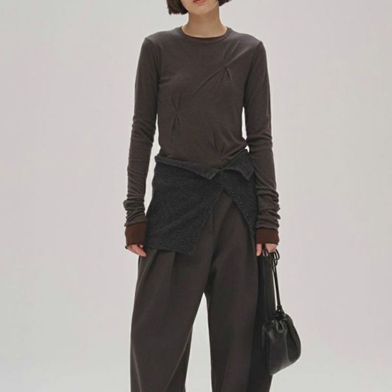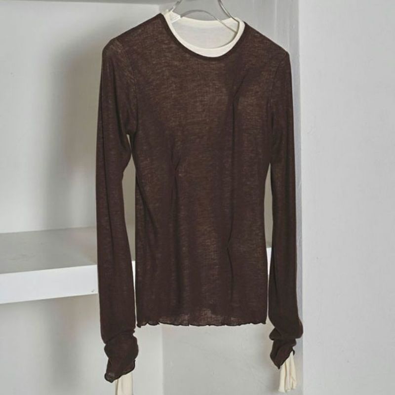 柔らかな天竺生地に、ほのかな透け感をもつリブ生地を重ねたレイヤードデザインが魅力です。