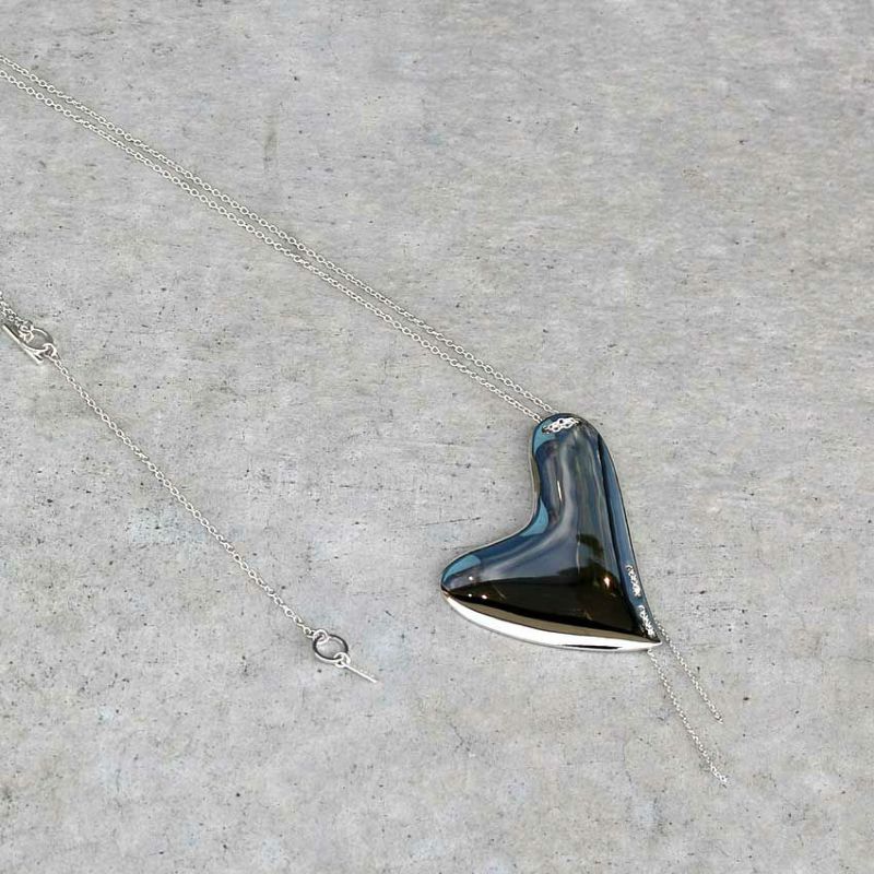 ハート型のプレートパーツに、片側のみステッチのようなチェーンをあしらったモードな印象が魅力的。