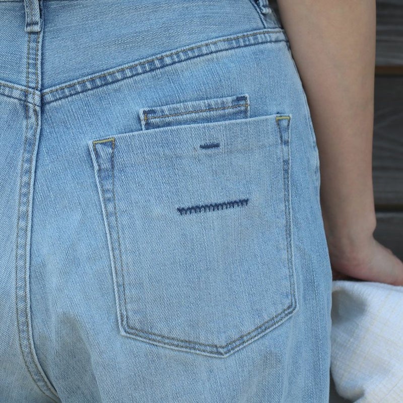 実際にメンズサイズを穿こうとするとウエストが合わなかったり、重さで下に下がってしまったり落ち着きが悪いですが、このジーンズは、ウエストがキュッとしまったジャストサイズなので、着心地のストレスなく穿いていただけます。