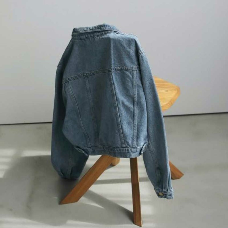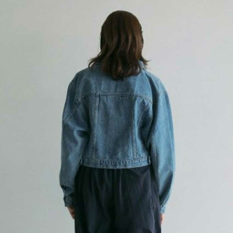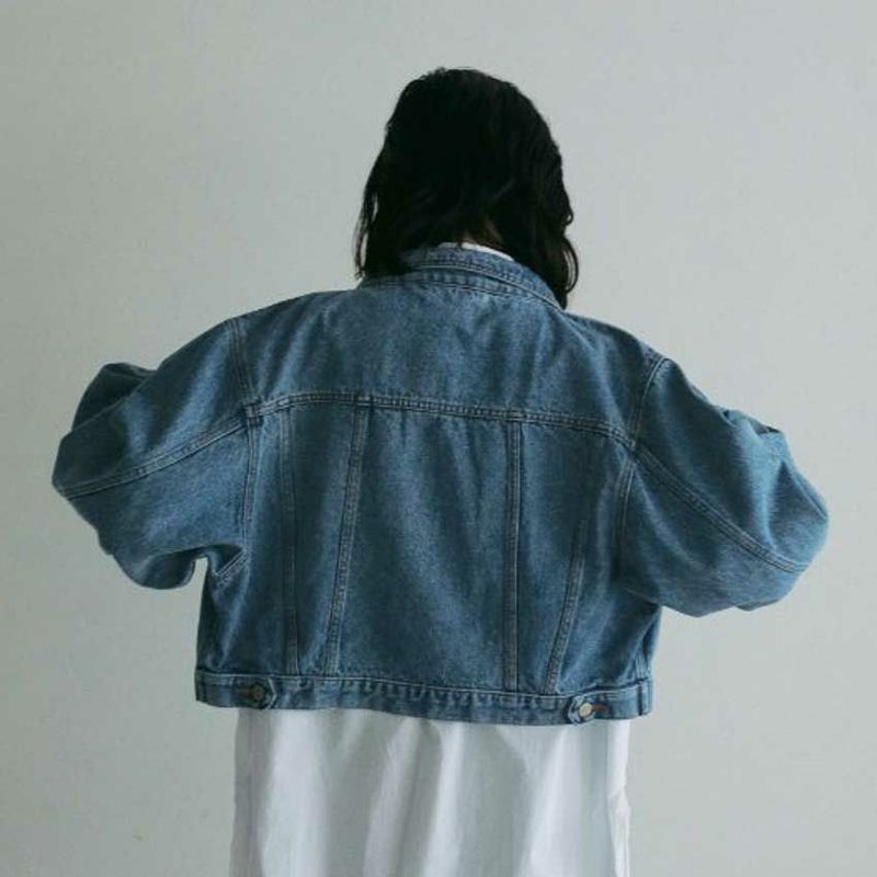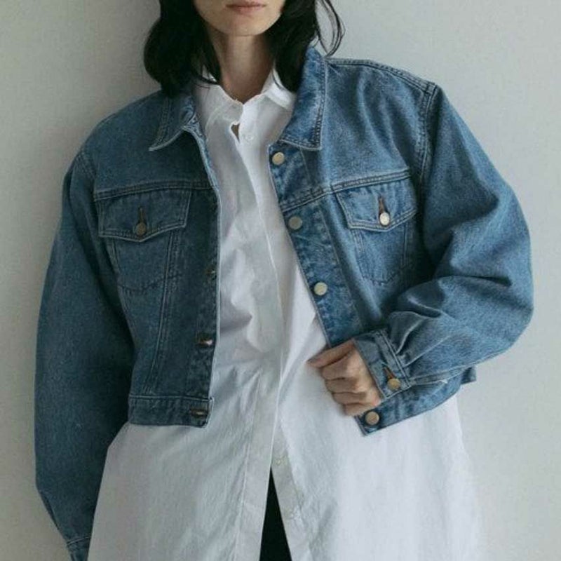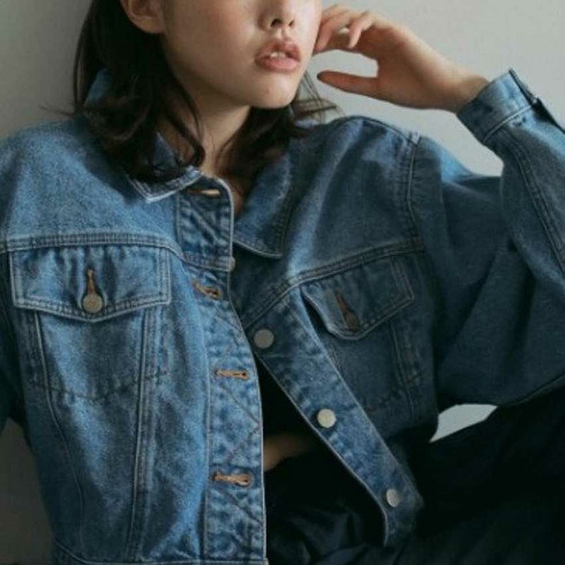 ヴィンテージ感あるブルーカラーのデニムジャケット。ワンピースや幅広いボトムと合わせやすいショート丈。
