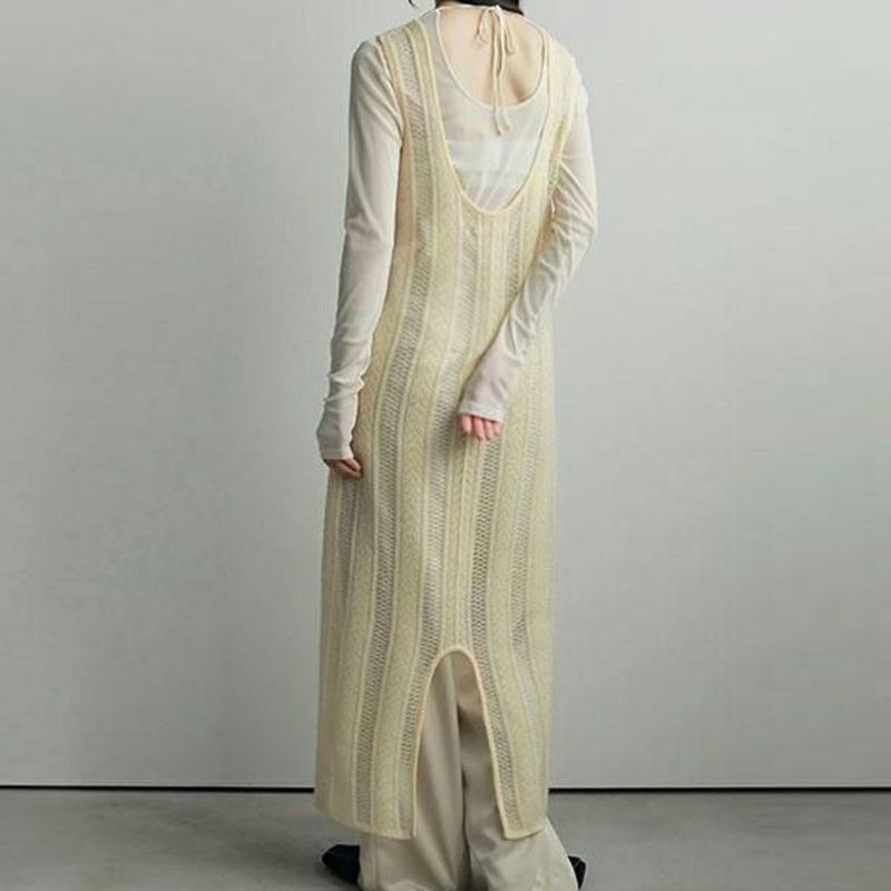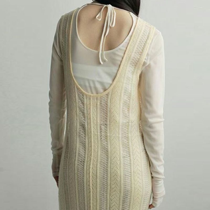Uネックデザインで、後ろの方が少し深めに開いています。透け感があるので、お手持ちのペチコート等と合わせたり、パンツとのレイヤードスタイルがおすすめです。
