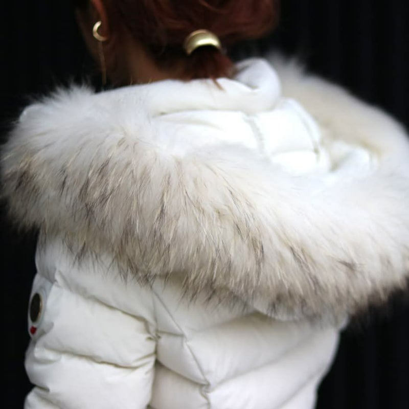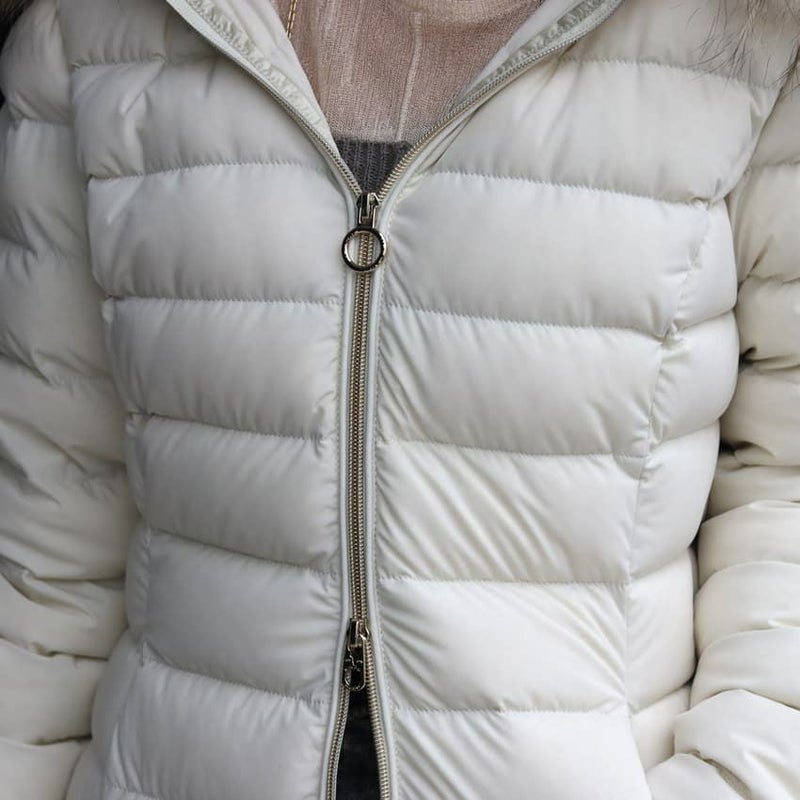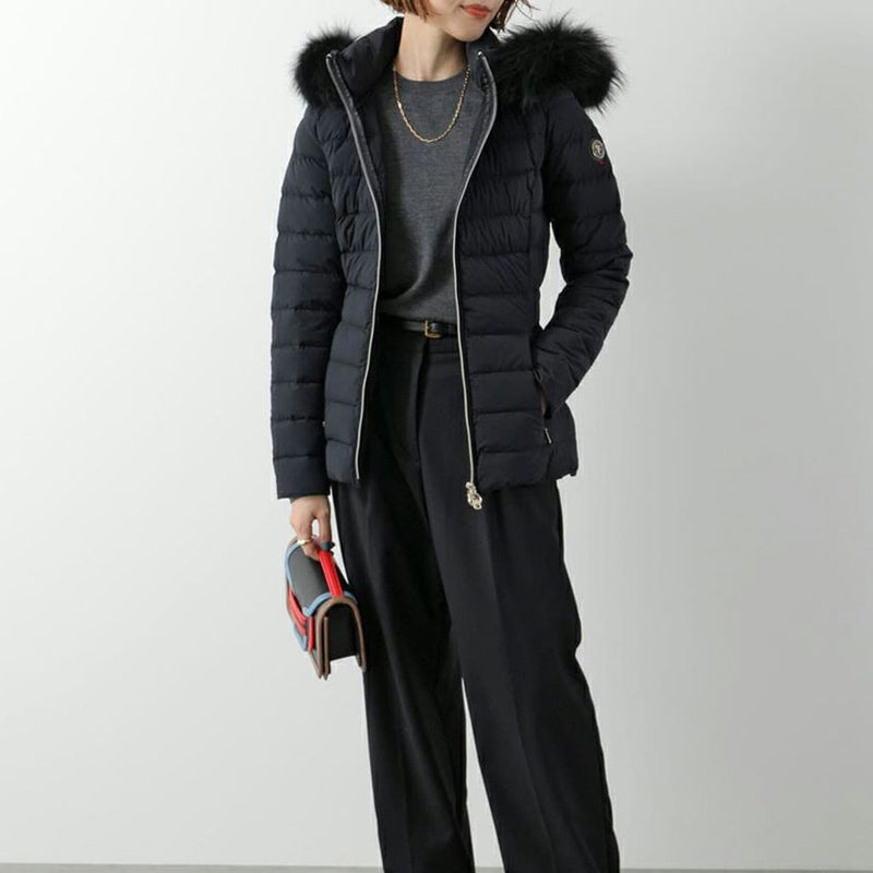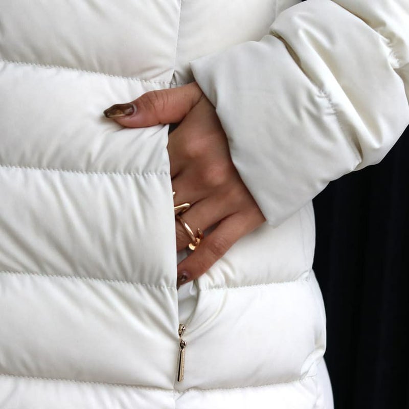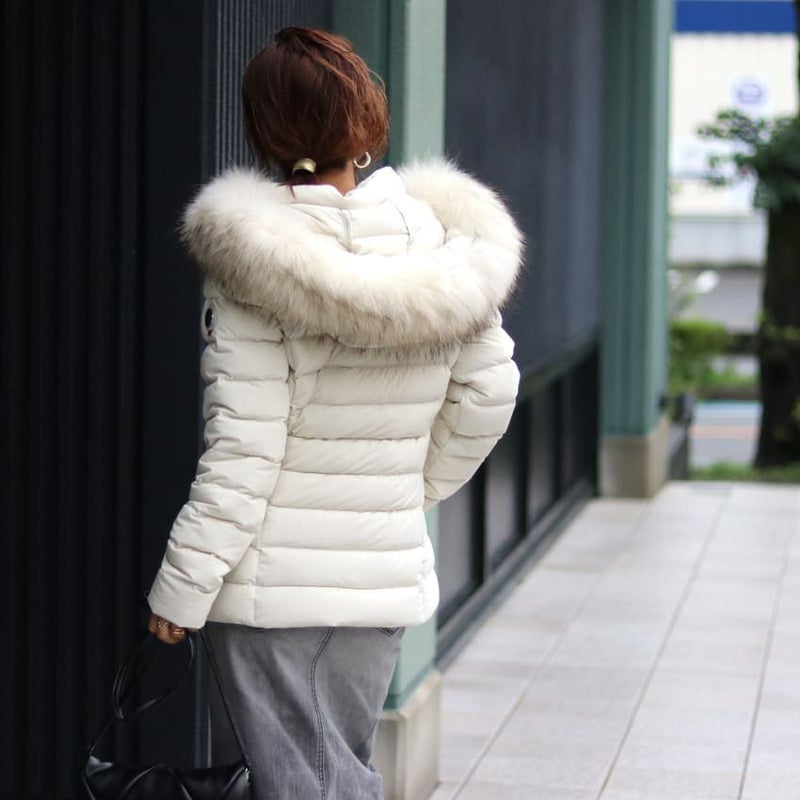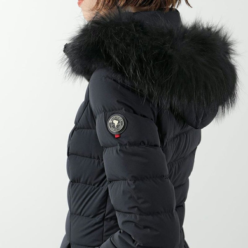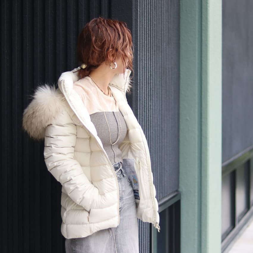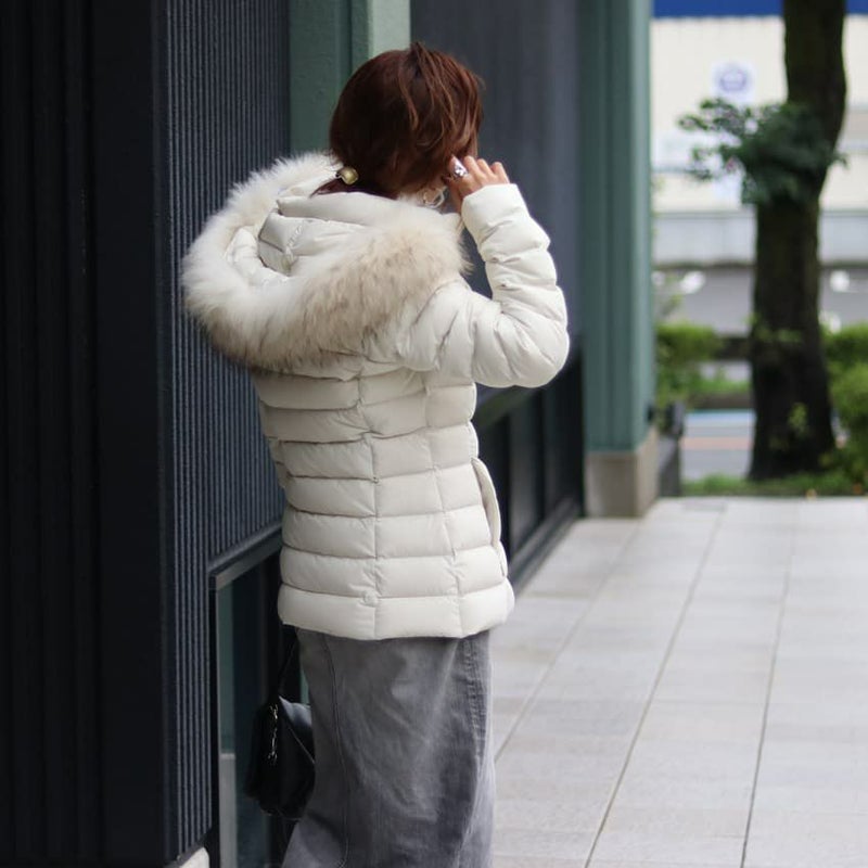 伸縮性に優れたストレッチ素材を使用した、細身のシルエットが女性らしいラクーンファーフード付きのダウンジャケット。