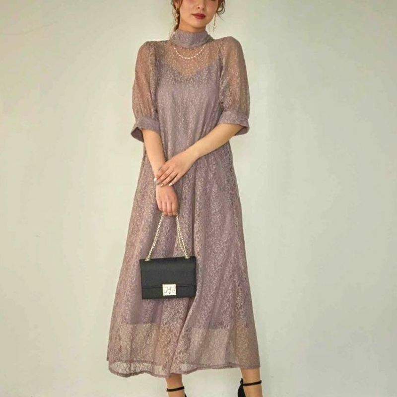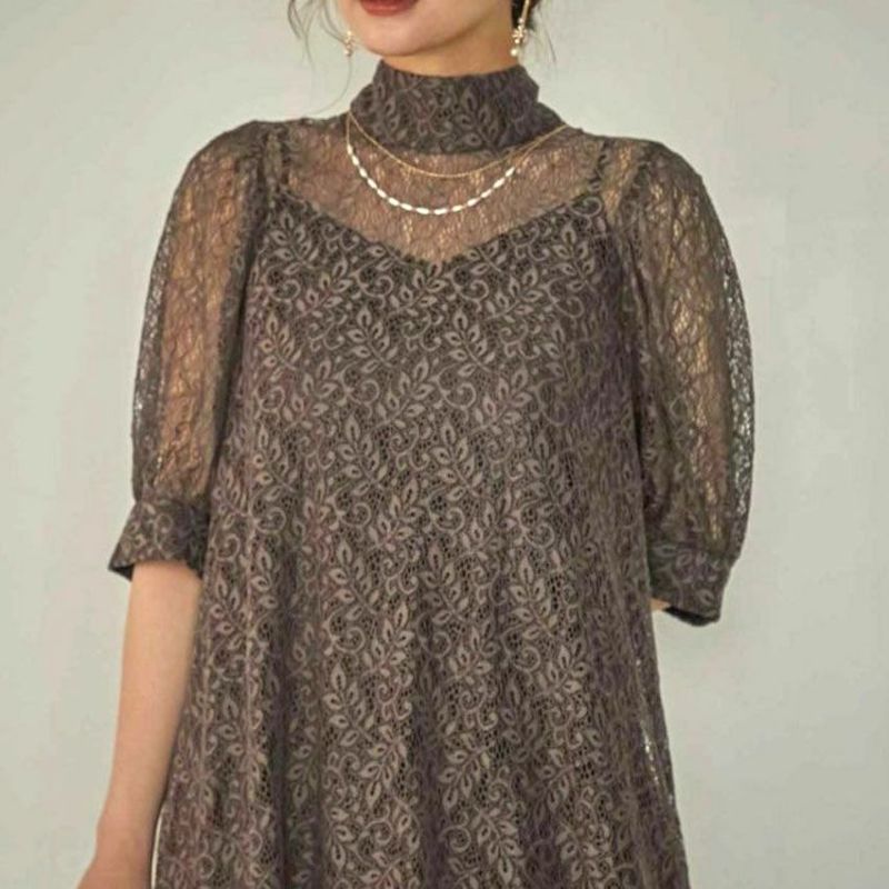 デコルテと袖部分のシアー感が全体の印象に軽さをプラスしてくれ、スタンドカラーでも抜け感ある印象に。
