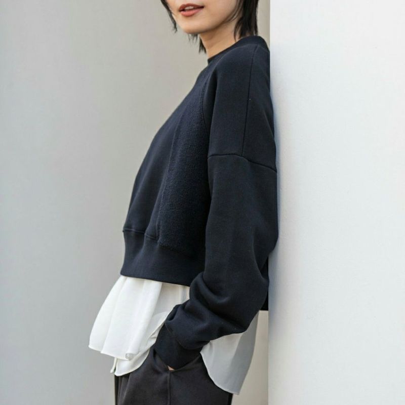 ラフに着られるコットン裏毛素材を使用した、今っぽいショートスウェットトップス。
