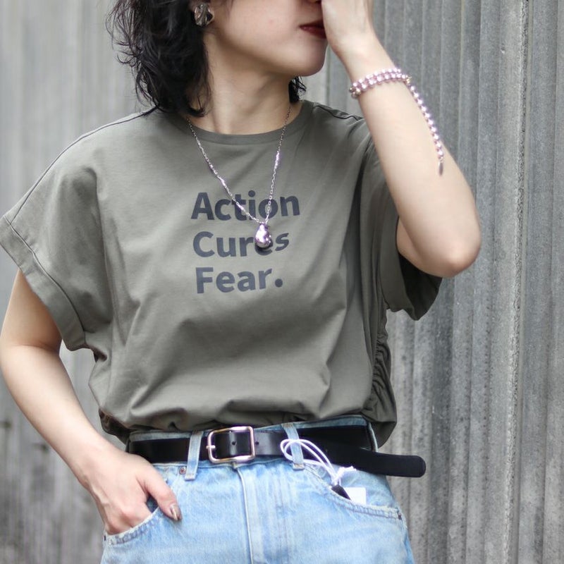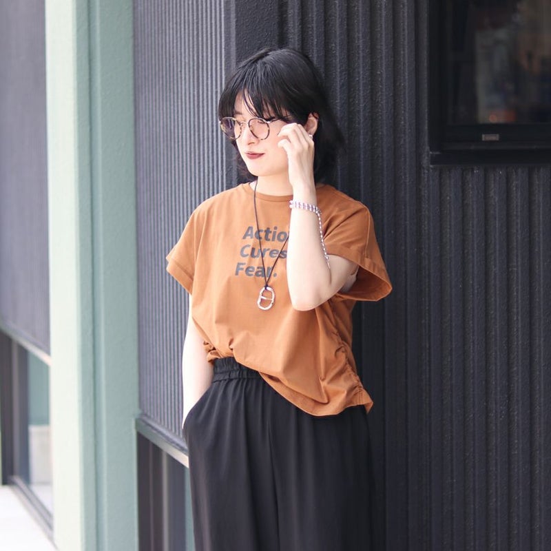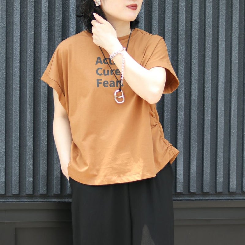 サイドに入ったギャザーが、さりげない立体感と女性らしさをプラスしてくれるロゴTシャツ。