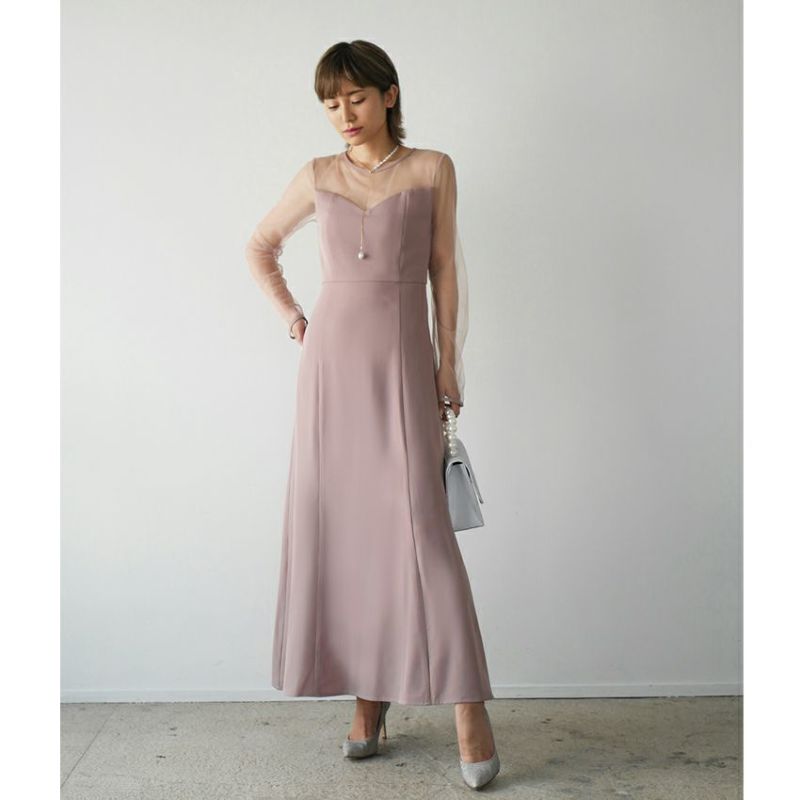 顔やデコルテをすっきり綺麗に見せる変形Vネックのシアーワンピース。