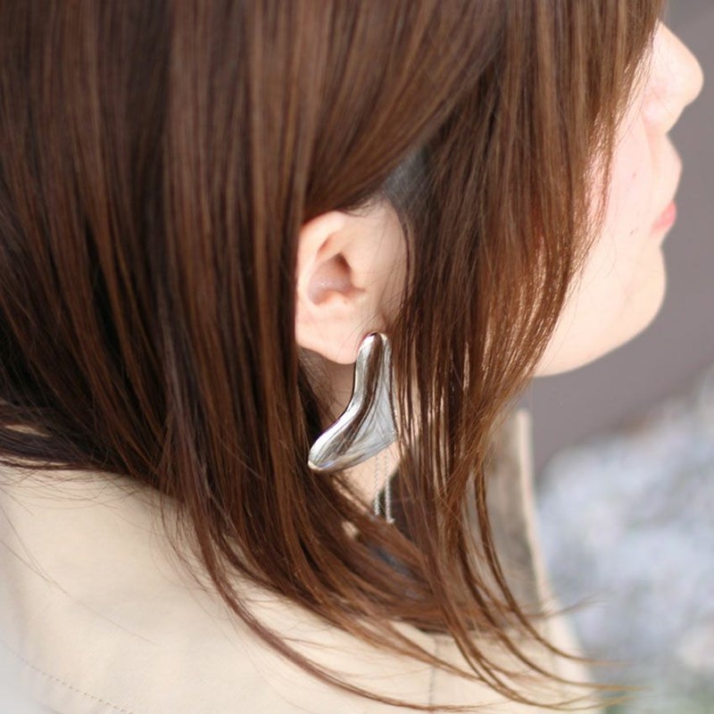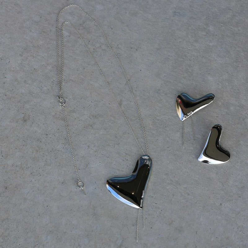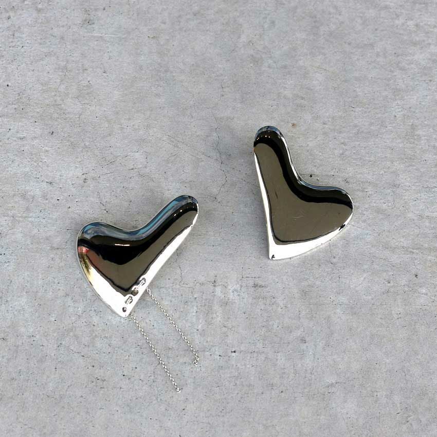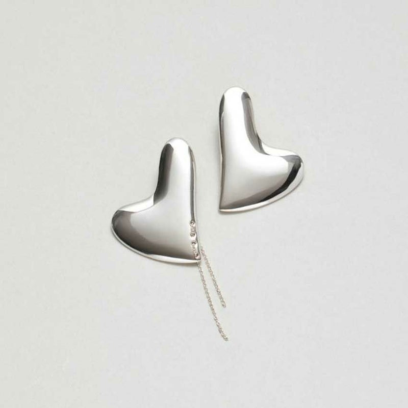ハート型のプレートパーツに、片耳のみステッチのようなチェーンをあしらったモードな印象がトレンド感あふれます。