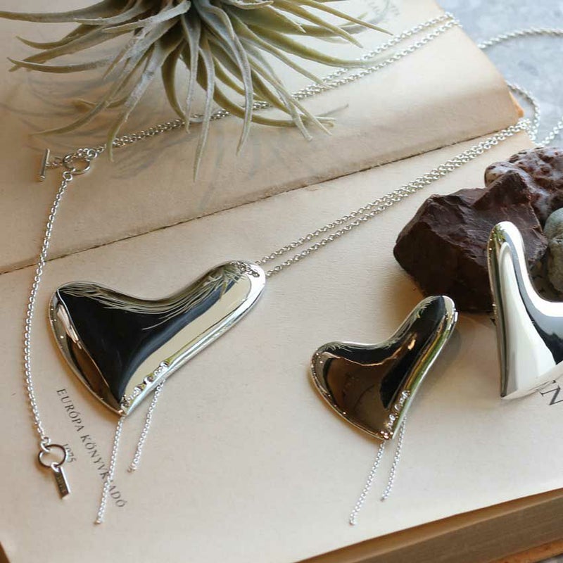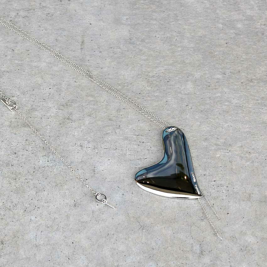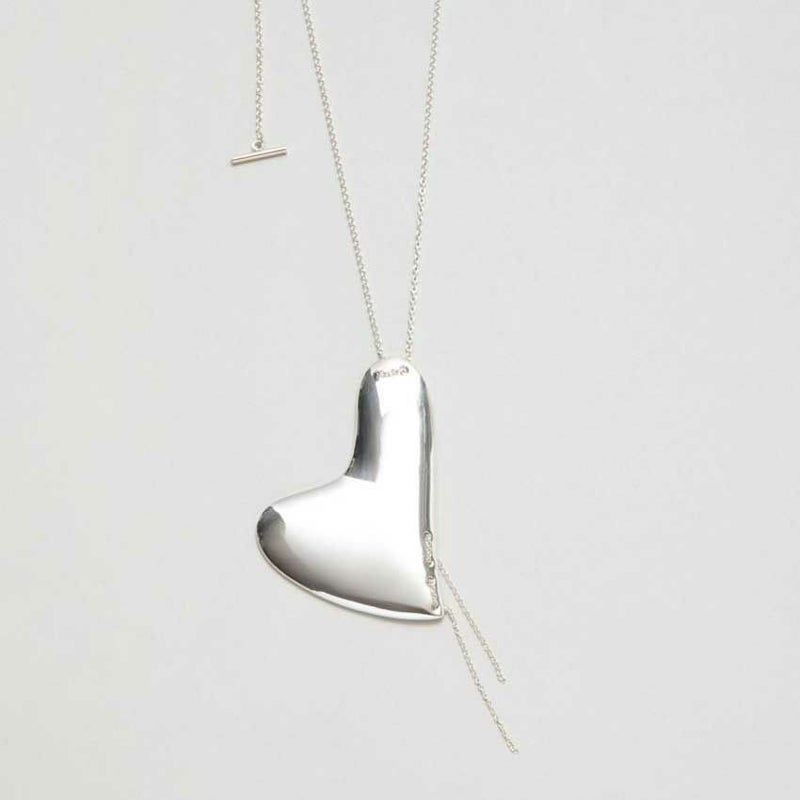 ハート型のプレートパーツに、片側のみステッチのようなチェーンをあしらったモードな印象が魅力的。