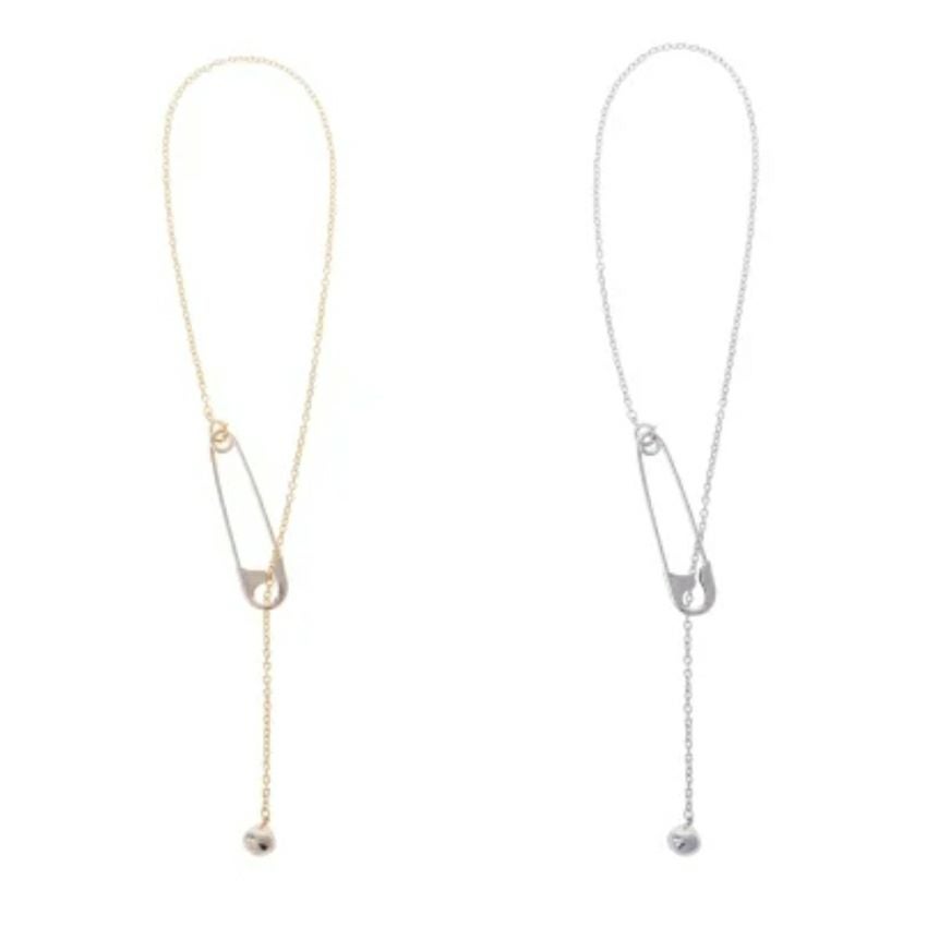 華奢なチェーンと大振りな安全ピンモチーフのコラボは他にない存在感を放つネックレス。