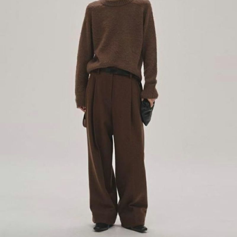 ミニマルなデザインのウエストラインや深めの股上にワイドなシルエットのバランスが魅力。