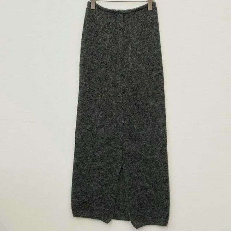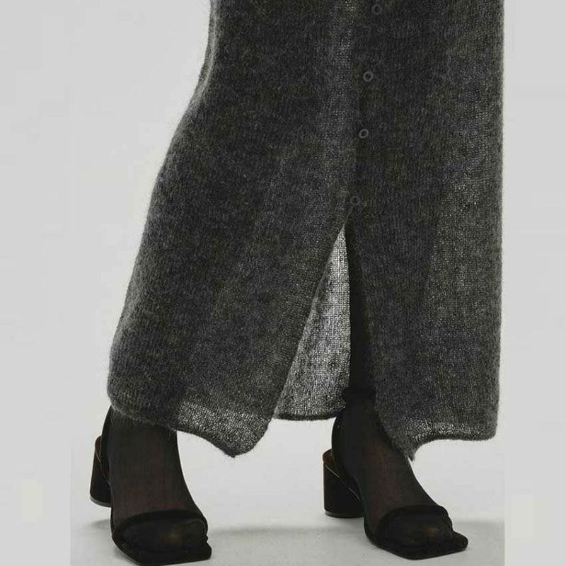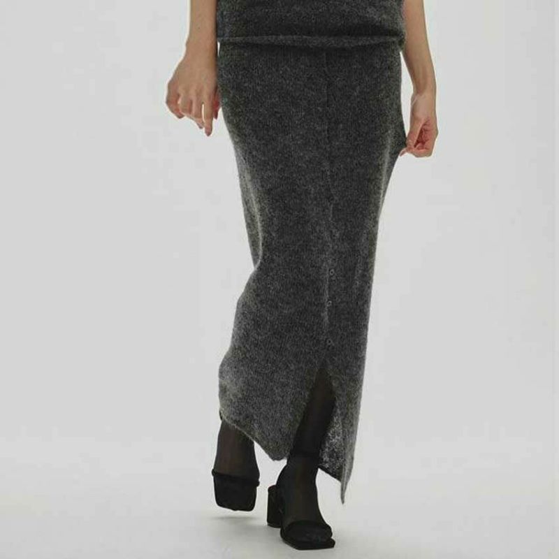 程よいシアー感で女性らしさを引き立てるデザインスカート。モヘア混の柔らかな糸で編み上げられ、フロントには華奢なボタンをたっぷりあしらいました。