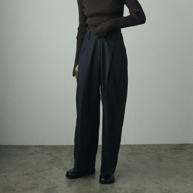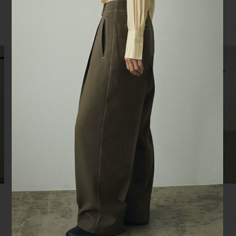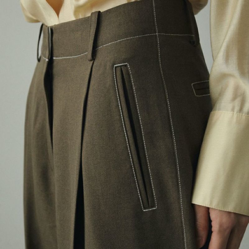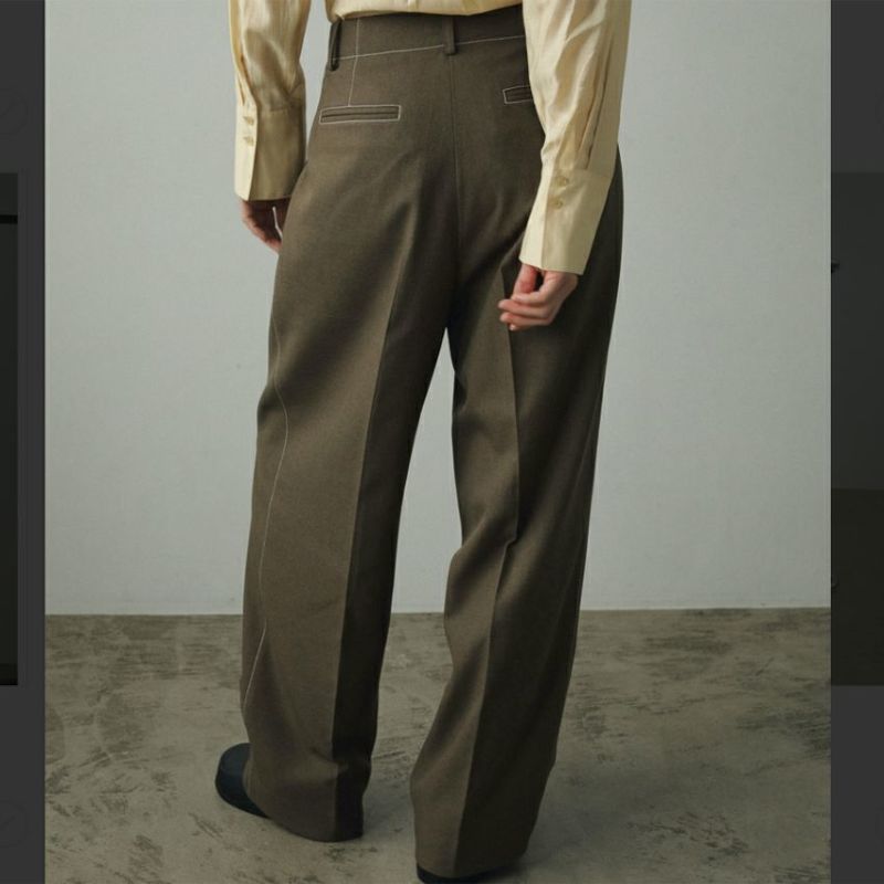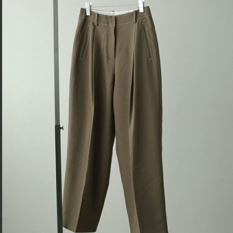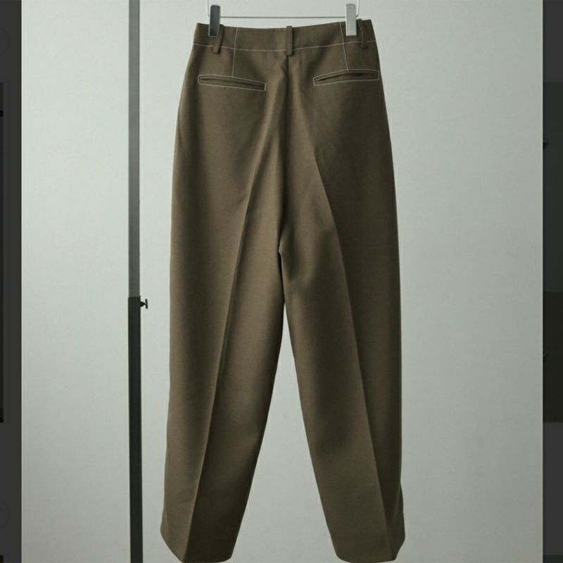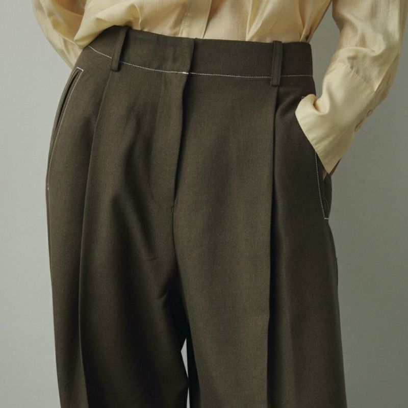 杢調の綺麗めに見える生地を使用したタックパンツ。ステッチを配色にしてポイントにしています。