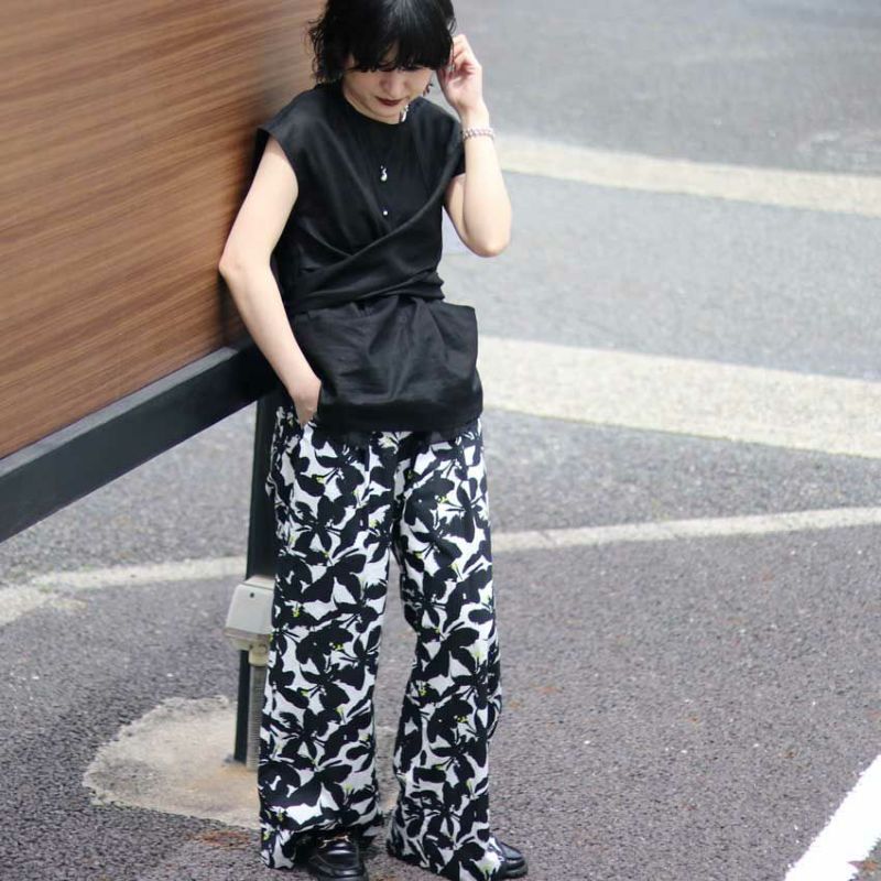 印象的な大柄フラワープリントが、シンプルなワイドパンツを一気に華やかモードへ。