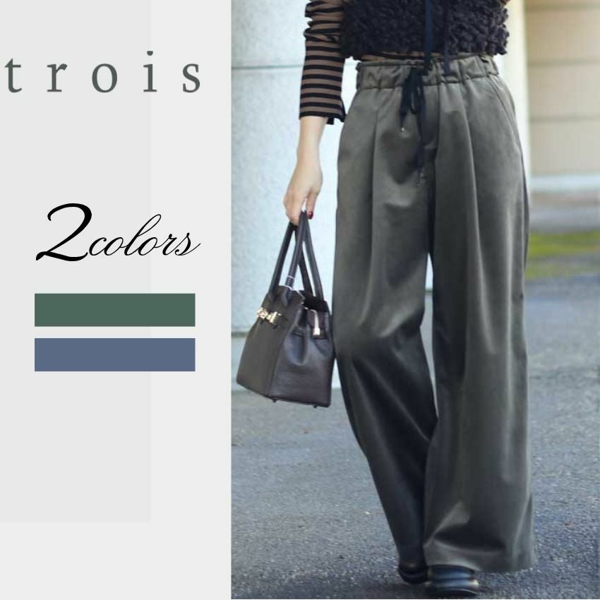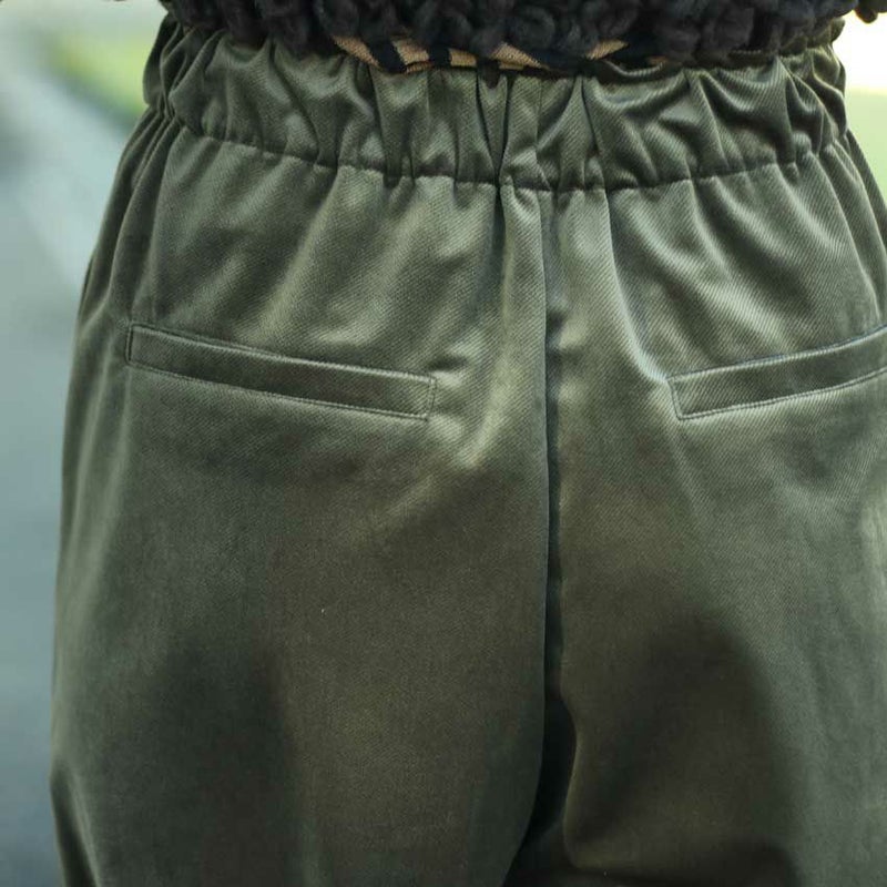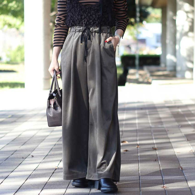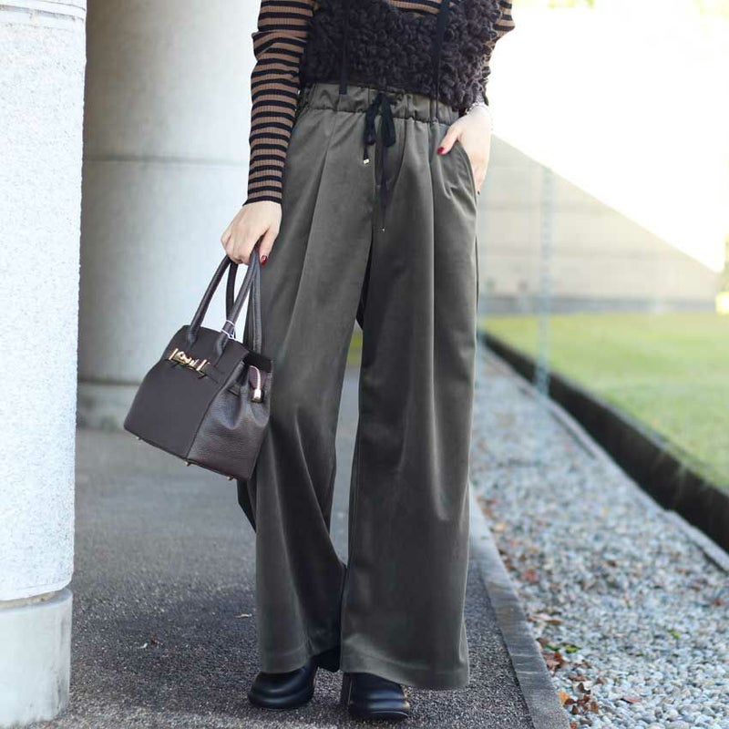 しなやかなドレープと上品な光沢感が魅力のベロアツイル素材を使用したセミワイドパンツ。