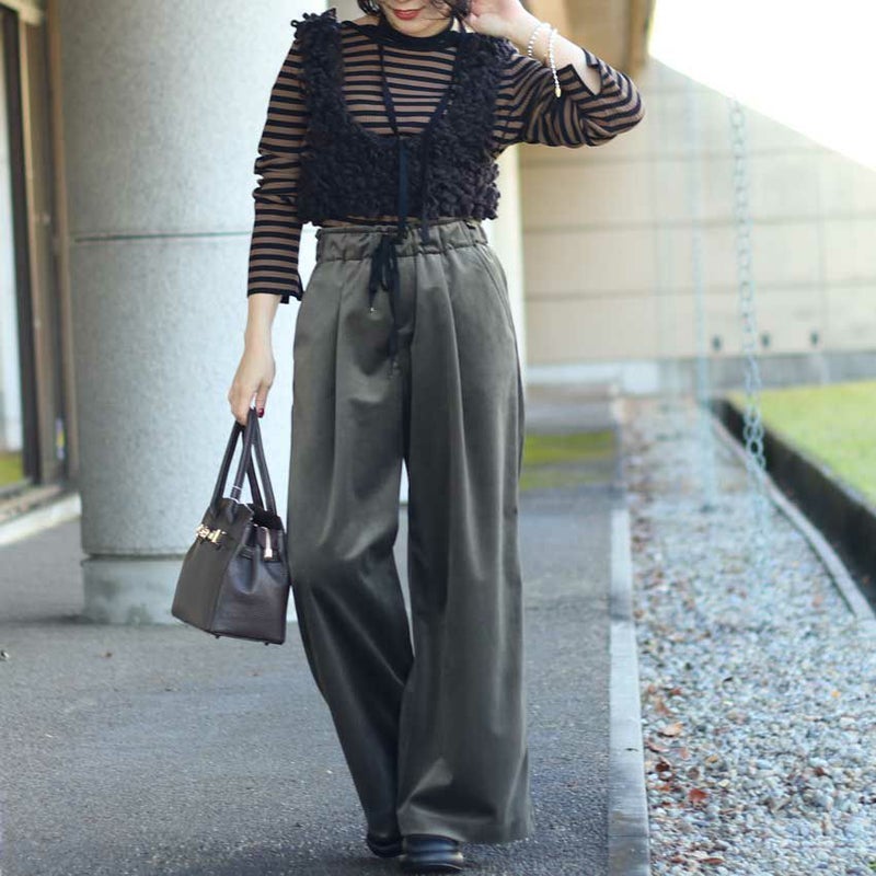深めのタックが足のラインを自然にカバーし、立体感のあるシルエットを作り出します。歩くたびに美しいドレープが揺れ、上品さを引き立てます。