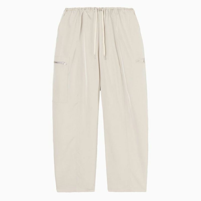 ほんのりとした光沢が上品さを引き立てるツイル素材で仕立てたドローストリングパンツ。
