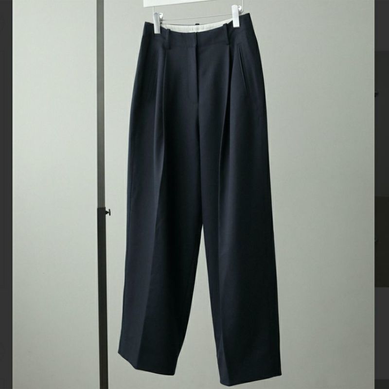 杢調の綺麗めに見える生地を使用したタックパンツ。ステッチを配色にしてポイントにしています。