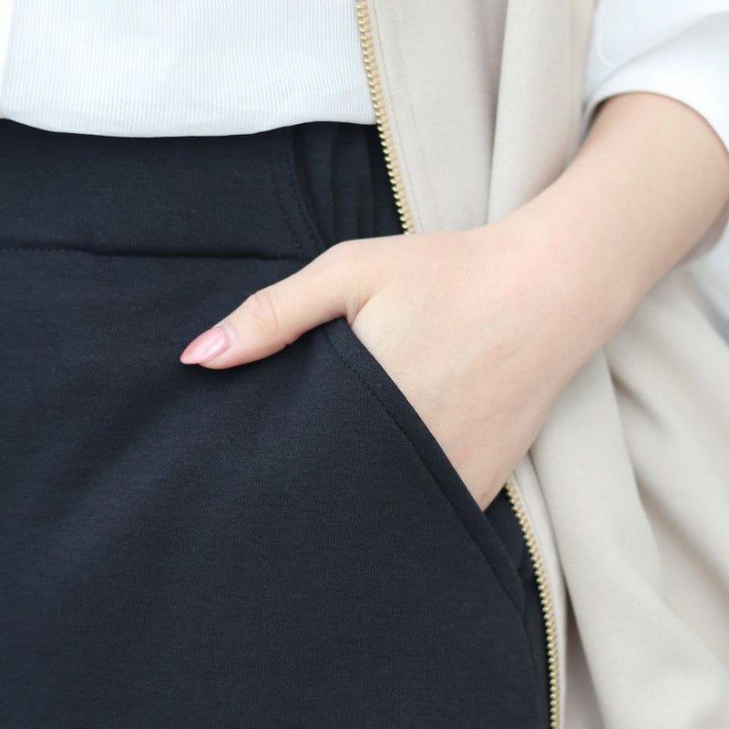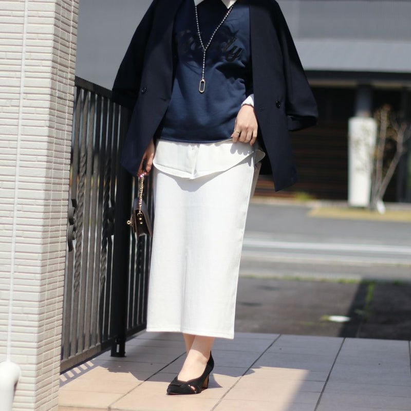 デザイン自体はシンプルながらも、高い着回し力と履き心地の気楽さ、スタイリッシュに見せるシルエットで非常に店頭でも人気のスカートです。