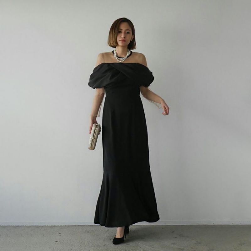 さらりと着るだけでキレのいい洒落感を出せるインパクトのあるオフショルダーデザインドレス。