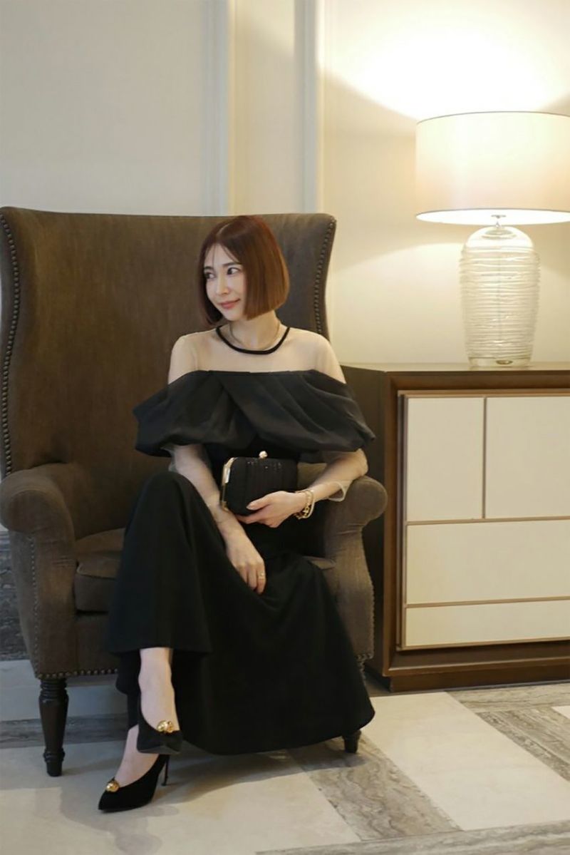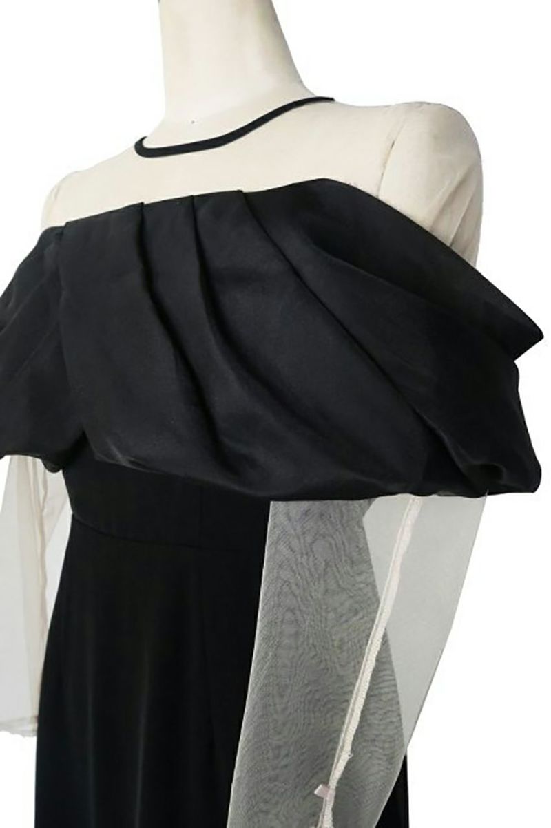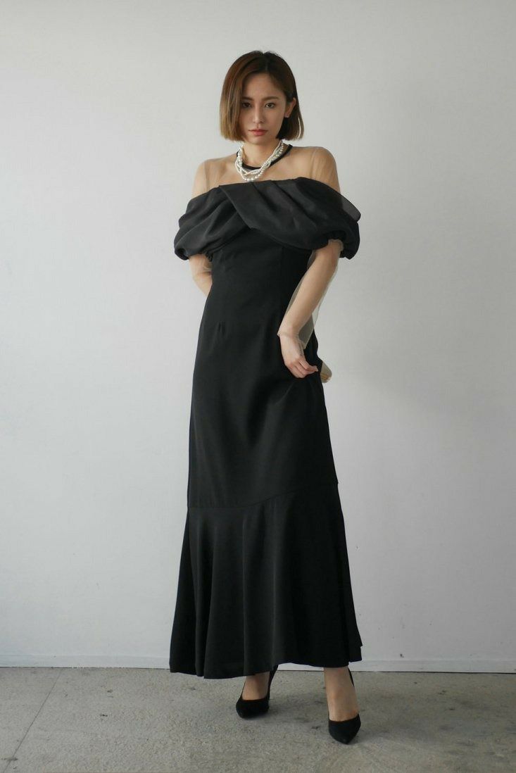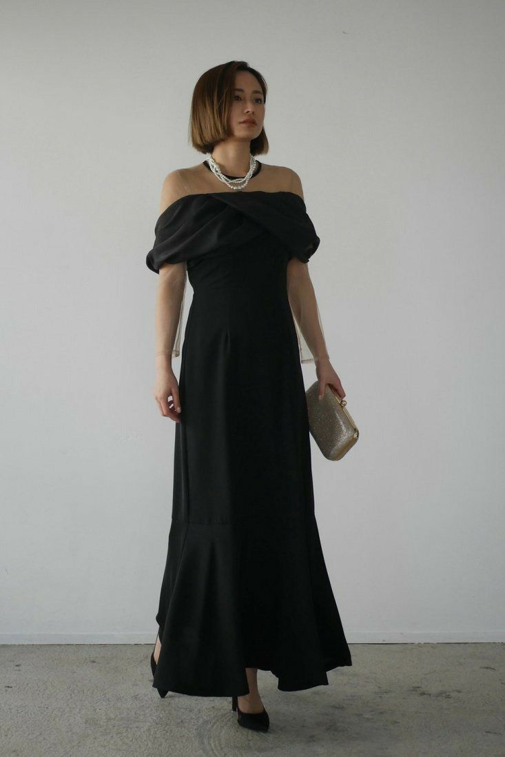 艶やかなシフォン生地のオフショルダーにチュール袖がドッキングすることで、適度な露出感の上品な1枚に仕上げました。