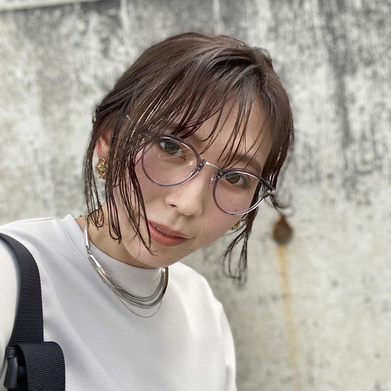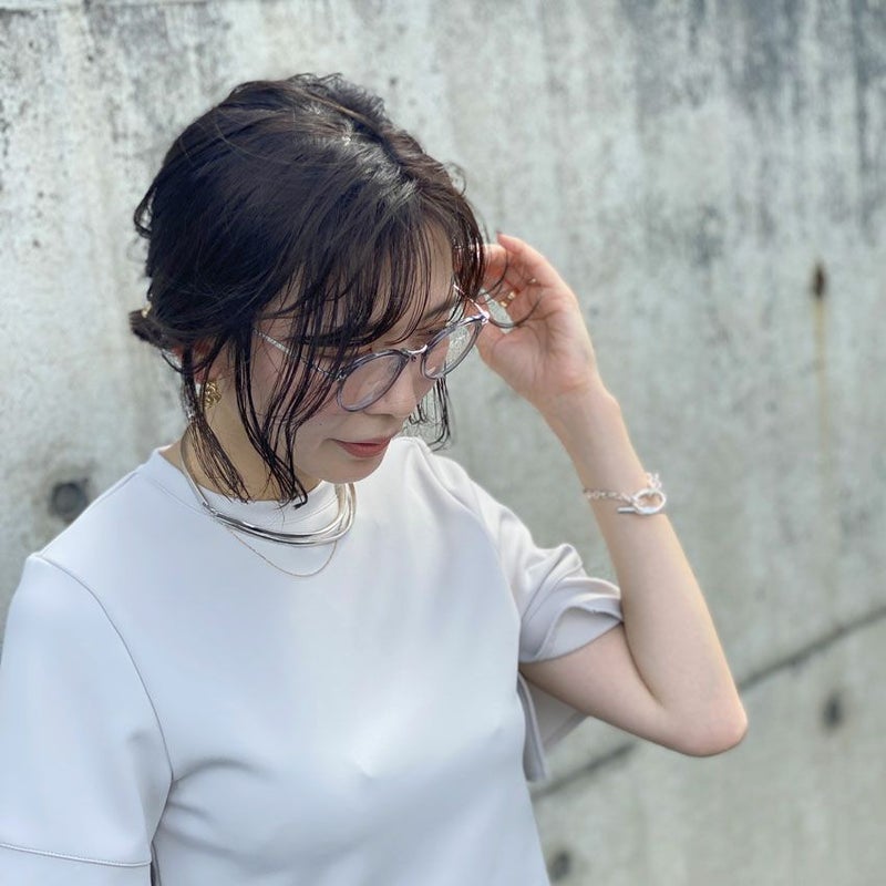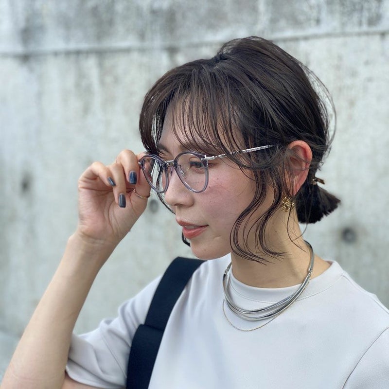 アイスグレーのクリアフレームの眼鏡はどんなコーディネートにも馴染みやすいのがポイント。