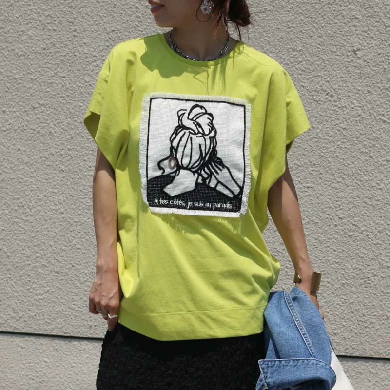 刺繍で描かれた“後ろを向いた女性”のデザインが印象的な、アートのような一枚。