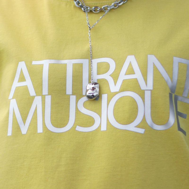 前身頃には、モードな雰囲気漂う英字ロゴを光沢感のある箔押しでプリントし、さりげなく華やかさをプラス。