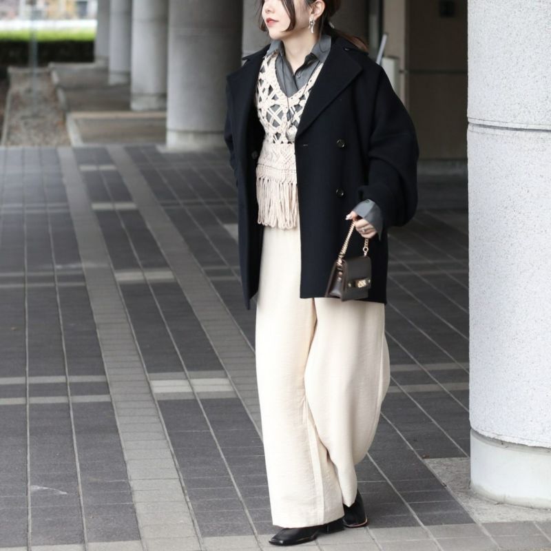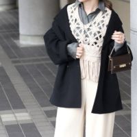 旬な大きめのダブルカラーは、顔回りを華やかに仕上げてくれます。