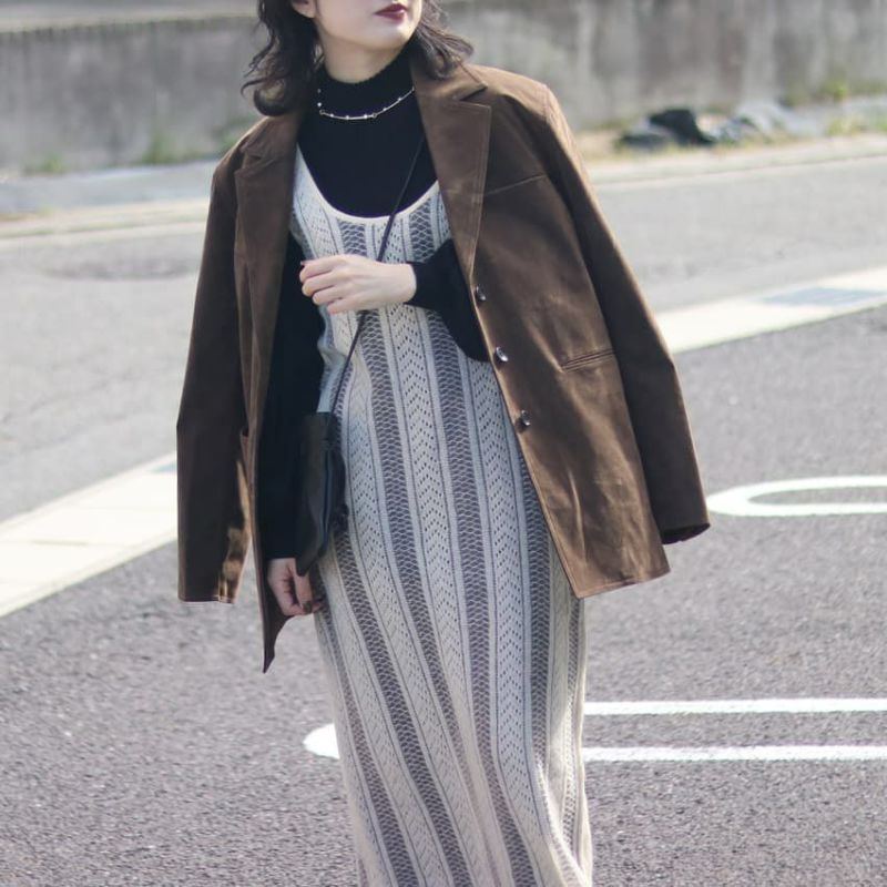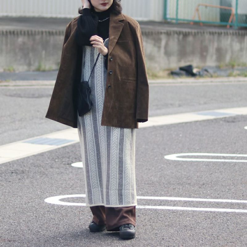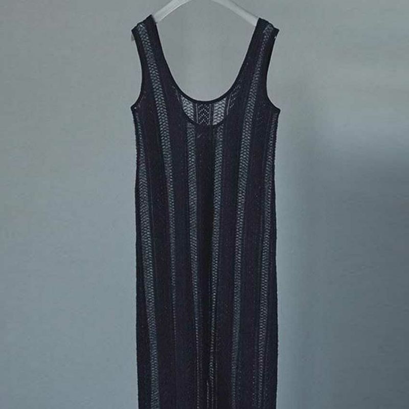 ふんわりと起毛したモヘア混の糸と細番手のシアー感のある糸をミックスさせた透かし編みのニットワンピース。