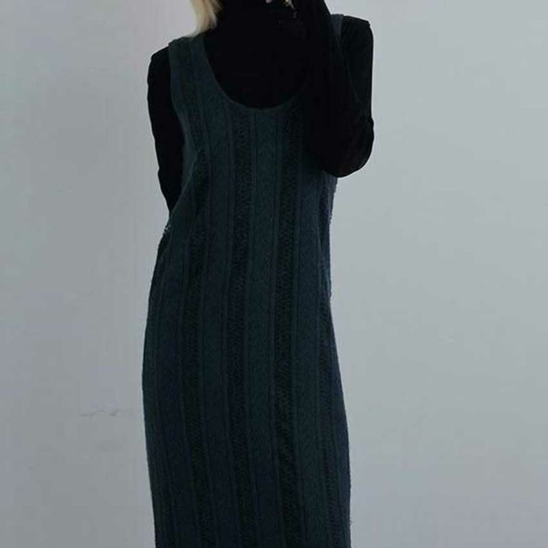 太めのストライプのように配置した柄で、柄のない部分はよく見るとメッシュのように編まれていて、奥行きのある編み地です。 Uネック