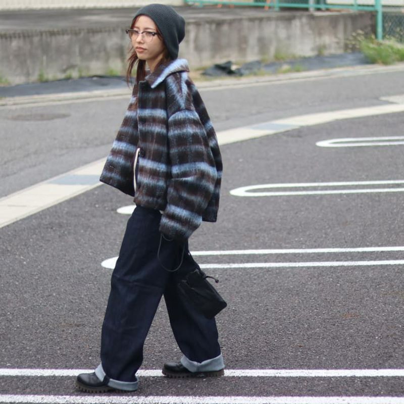 シャギーの柔らかな起毛感が、チェック柄に奥行きとニュアンスをプラス。