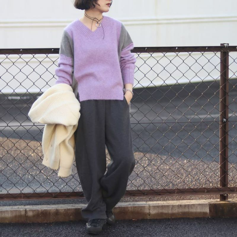 動くたびにドラマチックな表情を見せる、アルパカシャギーのカラーブロッキングニット。
