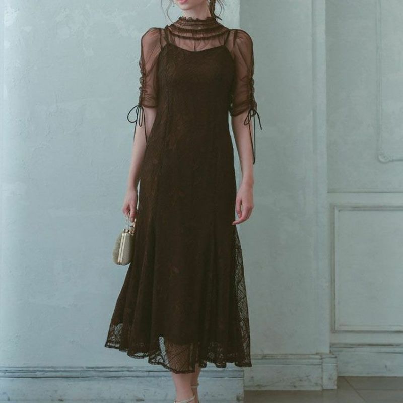 デザイン性の高いシアーブラウス×フラワーレースキャミのワンピース