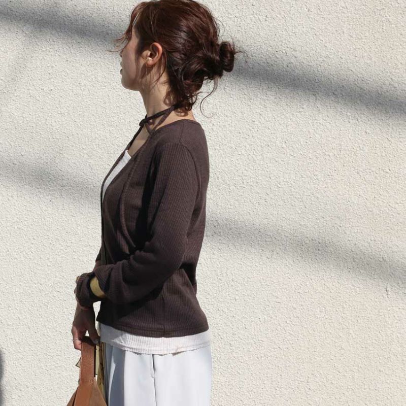首元の紐は前に垂らしてカジュアルに、後ろで結んで上品に…アレンジ次第で印象を変えられるのも魅力です。