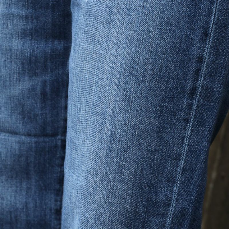 機能性素材らしからぬキャラクターのしっかりとしたオーセンティックなデニムらしい表情と本格的な加工感はそのままに、暑い時期でも快適に過ごせるデニムです。