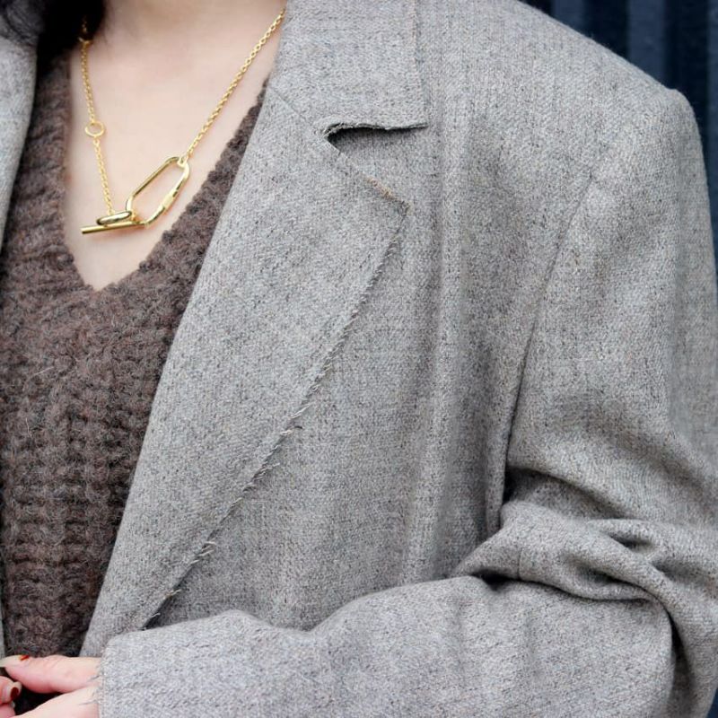肩にはさりげない薄めのパッドを仕込み、オーバーショルダーで仕立てることで、今季らしいモードなシルエットを実現。
