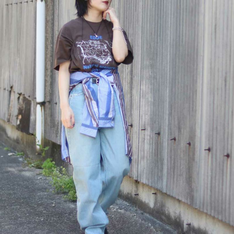 ブラウンはロゴが目立ったコントラストのある配色プリントで、シンプルな夏のスタイリングに映えます。